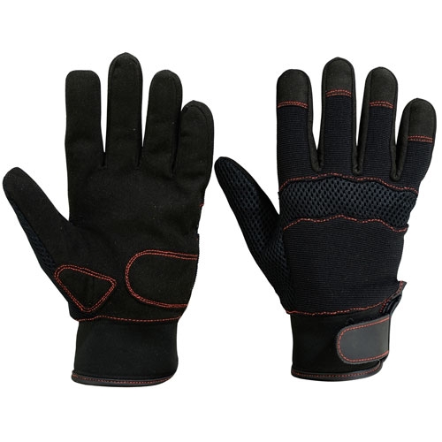 Black Synthetic Leather , Black Synthetic Leather on 3 Fingure Tips in Back , Foam Padded on Palm , Back Black Spandex , Black Mesh on Kunckle , Neoprene On Cuff , Hook & Loop Stapp