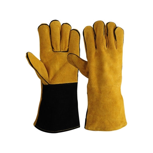 Palm & Top Made Of Golden Cow Split Leather, Wing Thumb, Black Welts On Seems, Palm Side Black Cuff , One Piece Back, Half Fleece & Half Cotton Lining,