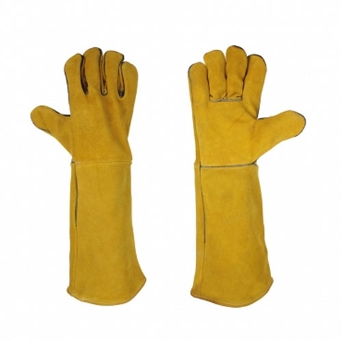 Palm & Top Made of Yellow Cow Split Leather, Wing Thumb, Black Welts on Seems, One Piece Back, Long Cuff Half Fleece & Half Cotton Lining