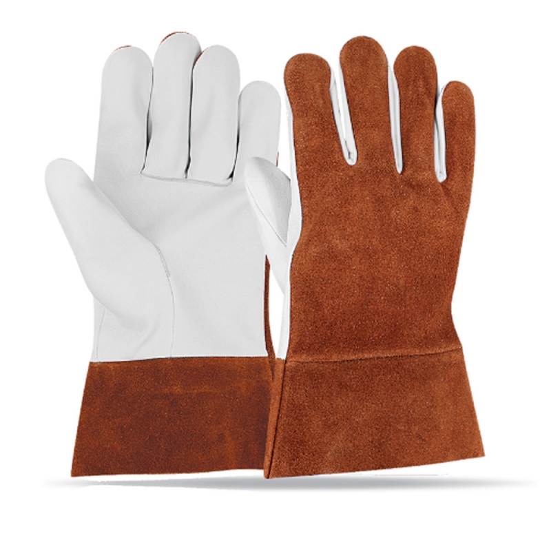 Leather: Palm & thumb goatskin leather Back Cow split leather Colour: Goatskin leather in natural color cow split in rust color Thumb: Straight Cuff: 2-1/2" Safety cuff in rust color