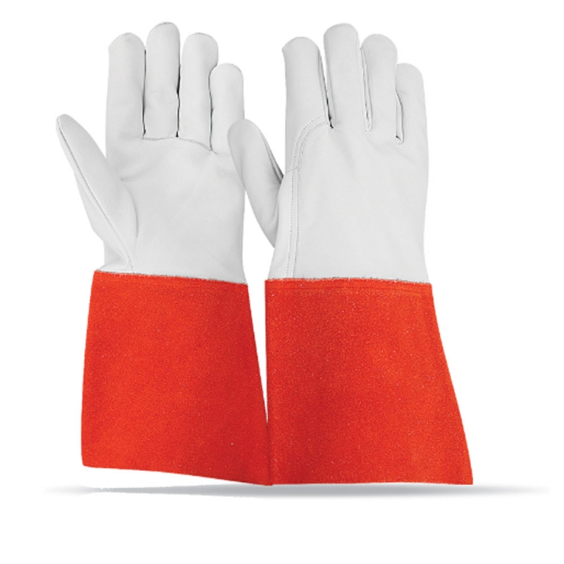 Leather: Sheepskin leather Colour: Natural Thumb: Wing thumb Cuff: 15 cm red cow split leather Additional: Index finger