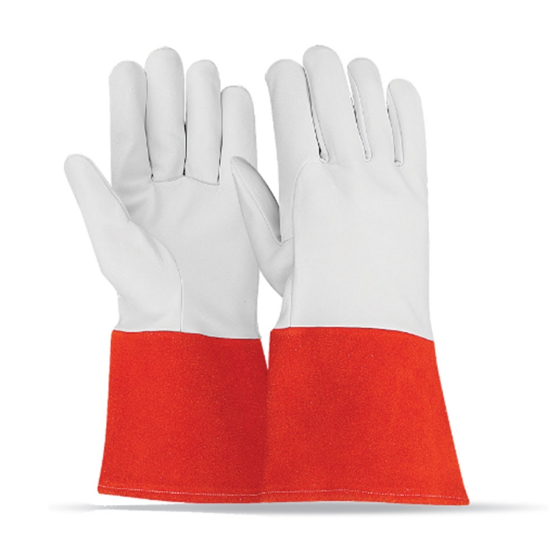 Leather: Goatskin leather Colour: Natural Thumb: Straight Cuff: 10 cm red cow split leather cuff Additional: Wrapped around index finger