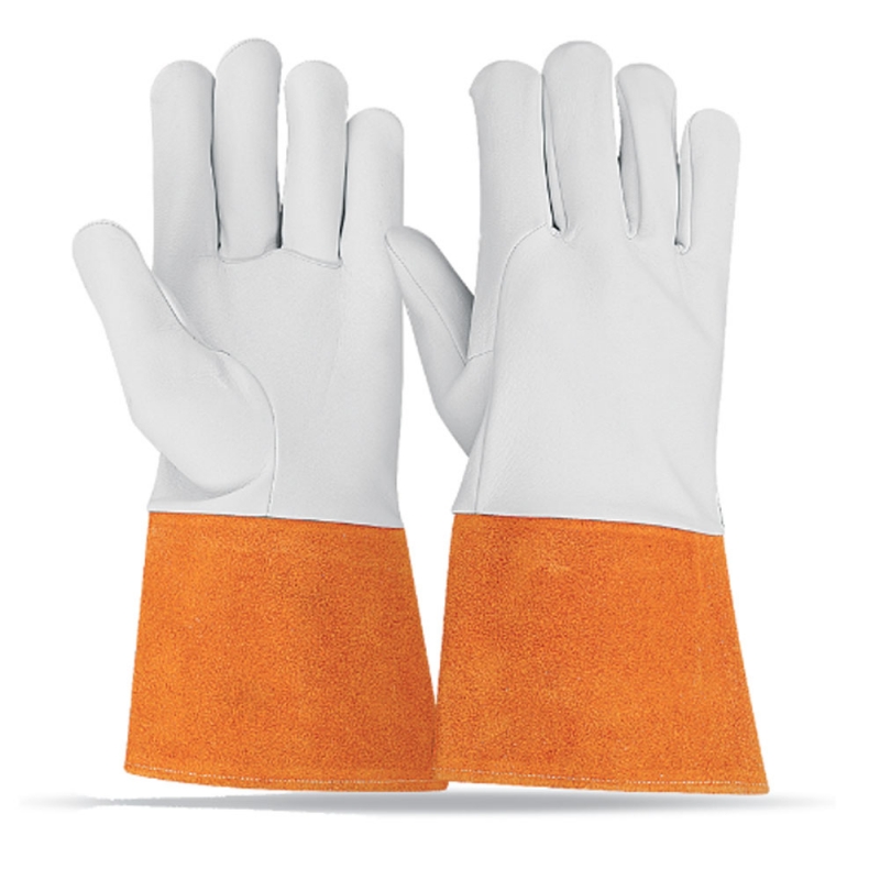 Leather: Goatskin leather Colour: Natural Thumb: Straight Cuff: 10 cm Orange cow split leather Additional: Wrapped around Index finger